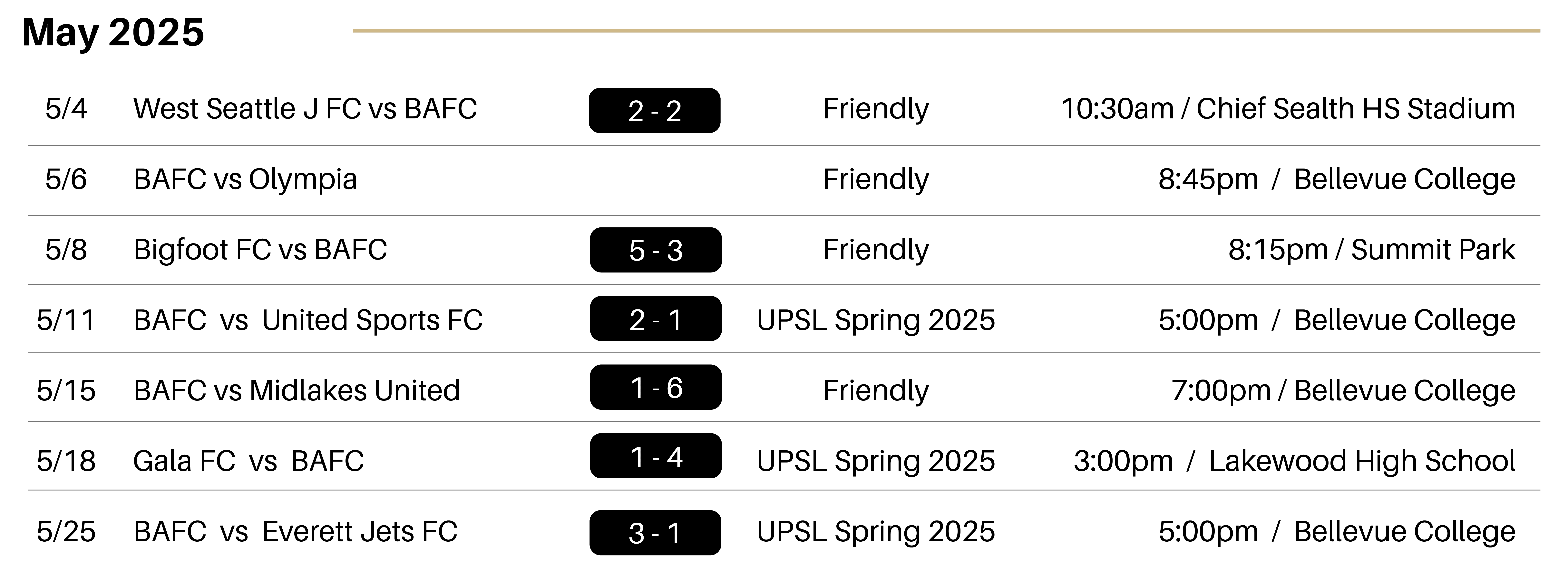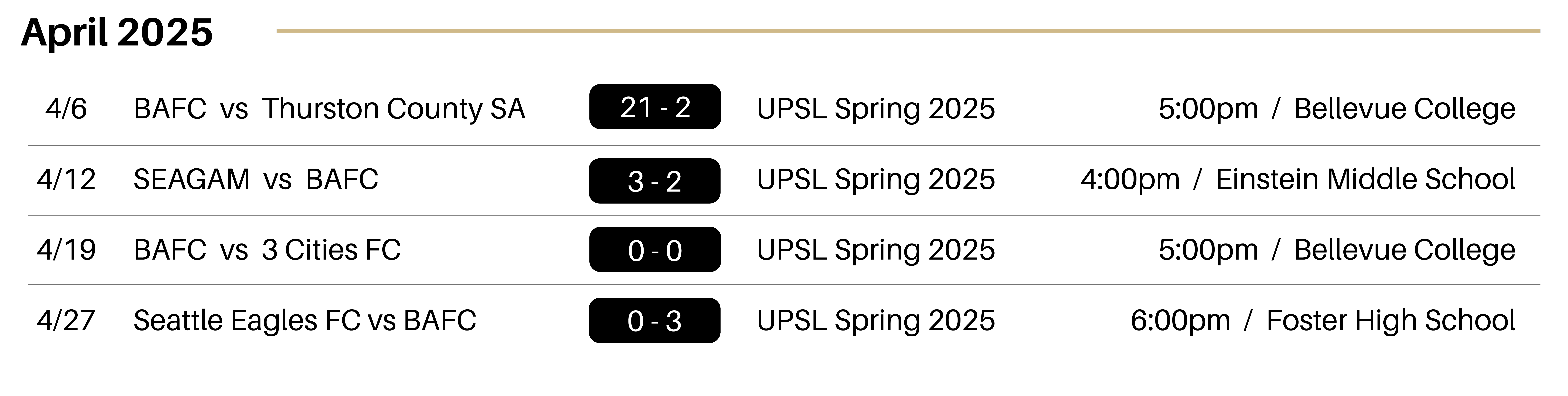 - Goals: 10′ Matheus Valentin (Jacen Stein), 30′ Dawda Dibba, 68′ Jacen Stein (Owen Gortner), 75′ Owen Gortner (PK)